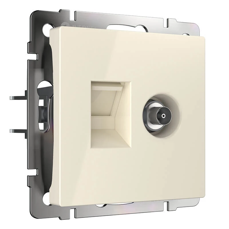 Дизайнерская розетка ТВ + RJ-45 6 cat. W1181303 слоновая кость глянцевый бренд Werkel является отличным решением для современных пространств. Данная модель будет эффектно смотреться в любом интерьере и гармонично сочетаться с любыми материалами. Розетка Werkel отвечает всем необходимым стандартам и ГОСТам, имеет высокое качество, подтверждённое сертификатами соответствия.Дизайнерские модели комбинируются с любыми рамками Werkel. Совместимость дает большой простор в создании множества уникальных сочетаний. Современные роезтки Werkel гармонично впишутся как в городских квартирах, так и в загородных домах, дачах.