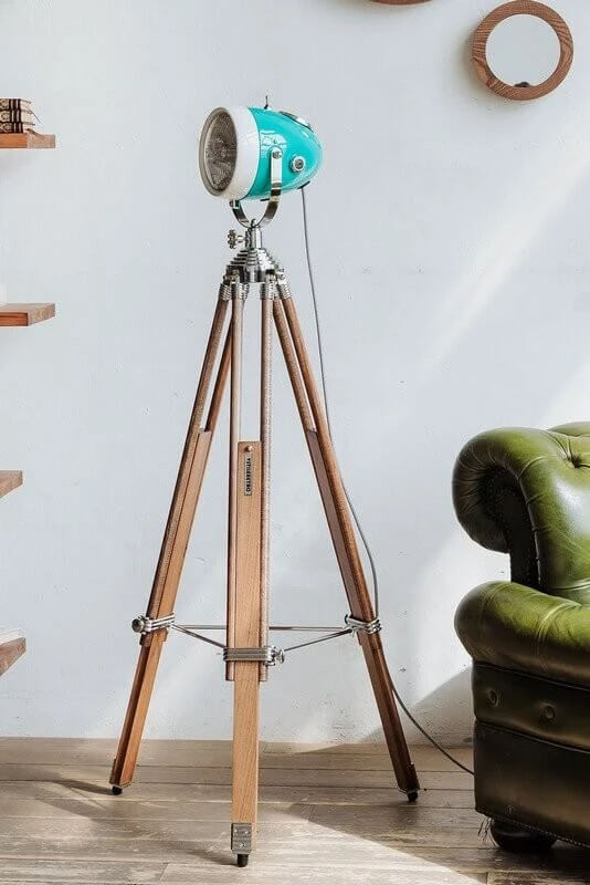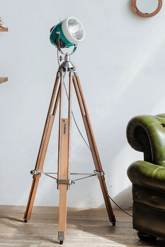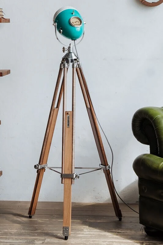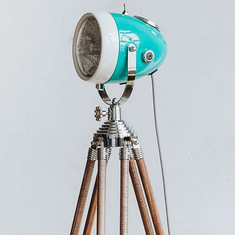 Винтажный напольный светильник – трипод серии RoadMaster выполнен из ретро фары от среднего/ легкого мотоцикла и регулируемой по высоте деревянной треноги с массивной никелированной фурнитурой. Фара каждого мото-торшера искусно отреставрирована и окрашена в винтажный цвет мятный.