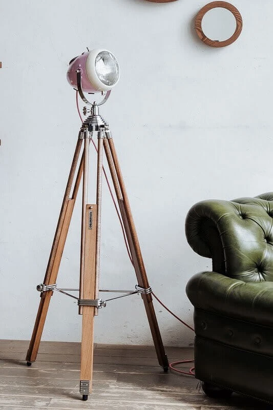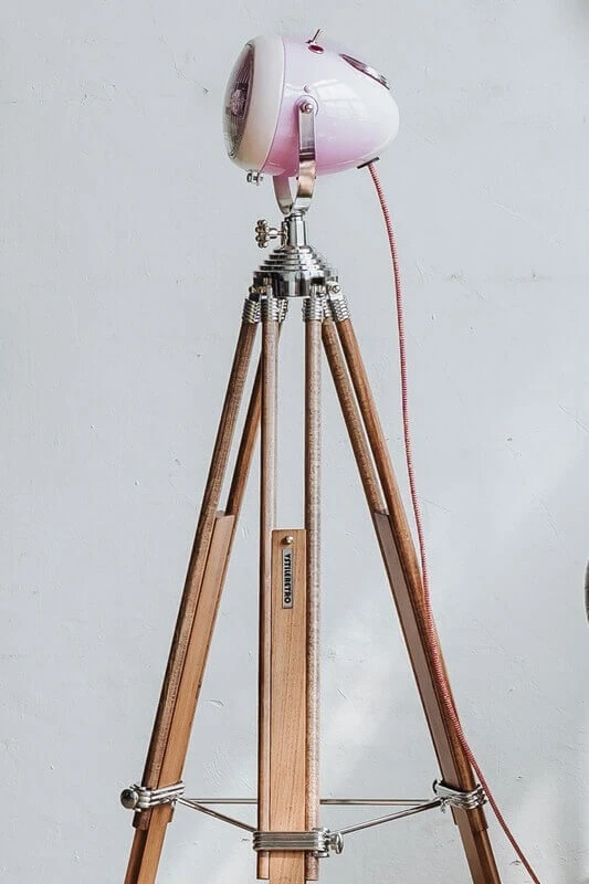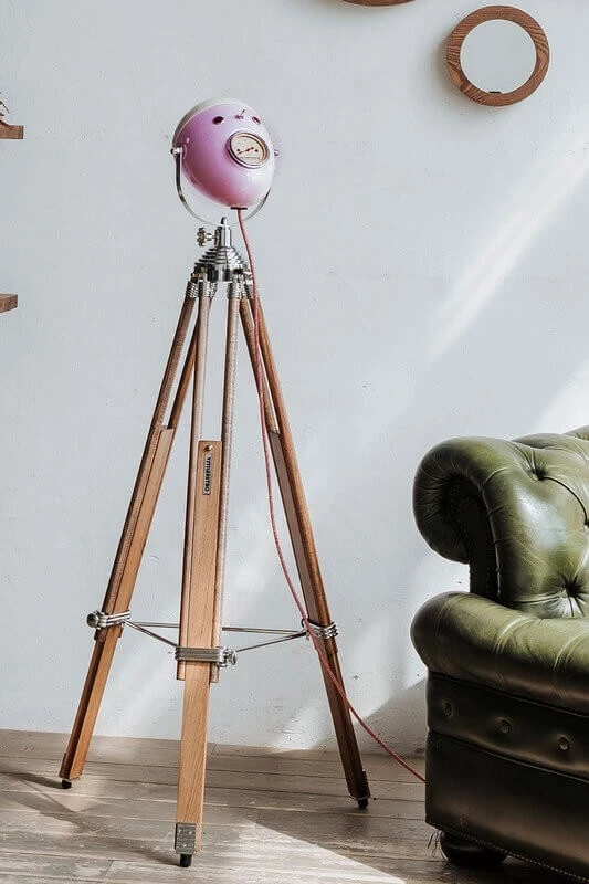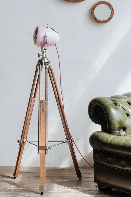 Винтажный напольный светильник – трипод серии RoadMaster выполнен из ретро фары от среднего/ легкого мотоцикла и регулируемой по высоте деревянной треноги с массивной никелированной фурнитурой. Фара каждого мото-торшера искусно отреставрирована и окрашена в винтажный цвет розовый.