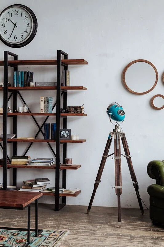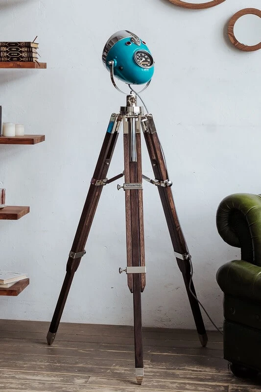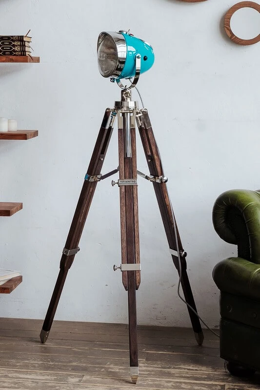 Винтажный напольный светильник – трипод серии HighWayStar выполнен из ретро мотоциклетной фары от тяжелого мотоцикла и регулируемой по высоте деревянной треноги с массивной никелированной фурнитурой. Фара каждого мото-торшера искусно отреставрирована и окрашена в винтажный синий цвет.