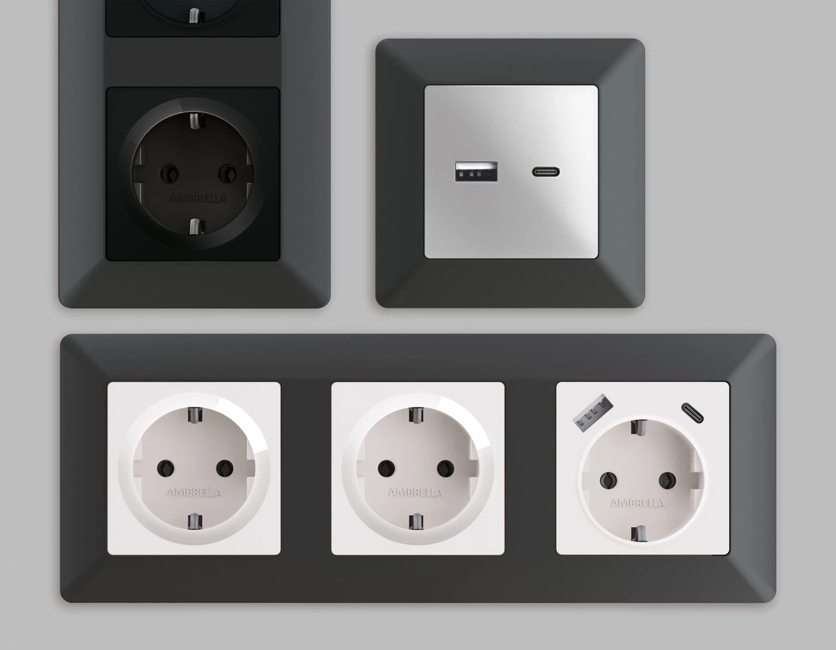 Многогранный ассортимент Ambrella Volt включает в себя механизмы, лицевые панели и рамки, а также комплекты, доступные в различных цветовых решениях. Продукция представлена в модульном исполнении, что позволяет гибко настраивать внешнийвид и функциональность. Вам будет легко заменить лицевую панель, рамку или механизм, найдя идеальное сочетание цветов.
