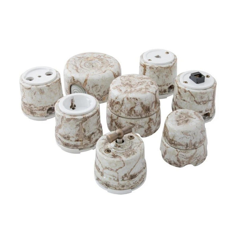 Декоративная распаечная коробка D60 Salvador малая цвета мрамор представляет собой отличное решение для современных интерьеров. Данная модель дизайнерской распределительной коробки особенно популярна в интерьерах в стилях ретро, лофт, стимпанк, модерн и минимализм.Винтажная распаячная коробка Сальвадор D60 цвета мрамора отвечает всем необходимым стандартам и ГОСТам, имеет сертификат качества. Если у Вас есть чувство вкуса, то при выборе распределительной коробки Вы не сможете пройти мимо без интереса мимо ретро данной модели торговой марки Сальвадор.Дизайнерская распаячная коробка цвета светлого мрамора отлично сочетается в комплектации с наружной ретро проводкой, ретро изоляторами и винтажными выключателями. Таким образом приобретая комплект ретро электрики Вы получаете не только электрификацию Вашего дома, но и отличное декоративное решение!