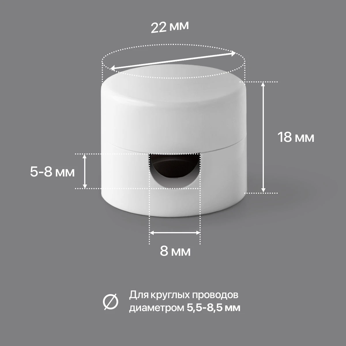 Размер изделия: высота – 18 мм, диаметр – 22 мм. Размер отверстия под провод: ширина – 8 мм, высота регулируется от 5 до 8 мм.