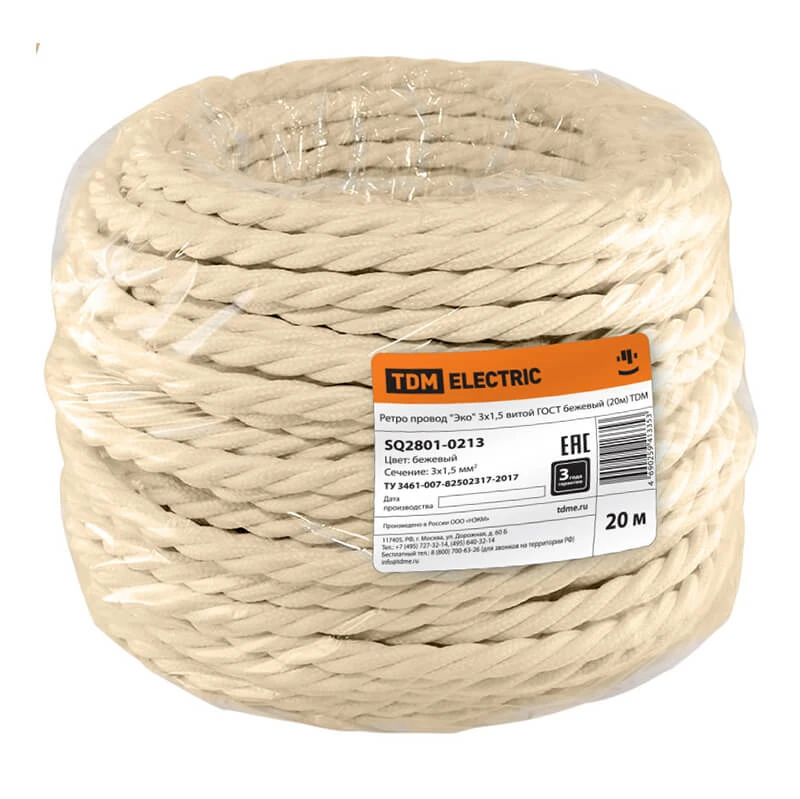 Ретро кабель электрический SQ2801-0213 TDM ELECTRIC цвет бежевый великолепно подходит для современных интерьерных решений. Винтажный провод TDM ELECTRIC SQ2801-0213 высокого качества. Он разработан с учётом всех современных требований, стандартов и ГОСТов.Цвет бежевый один из самых популярных цветов, используемых в ретро электрике. Не удивительно, что витой провод сечением 3*1.5 очень часто используется дизайнерами, как при классических интерьерных решениях, так в стилях лофт, стимпанк, эко. Дизайнерский кабель прекрасно сочетается в комплектации с интерьерными распределительными коробками, ретро втулками и дизайнерскими выключателями.Наружная оплетка витого ретро кабеля TDM ELECTRIC SQ2801-0213 имитирует натуральный шелк, что придает такому интерьерному аксессуару особый винтажный шарм!