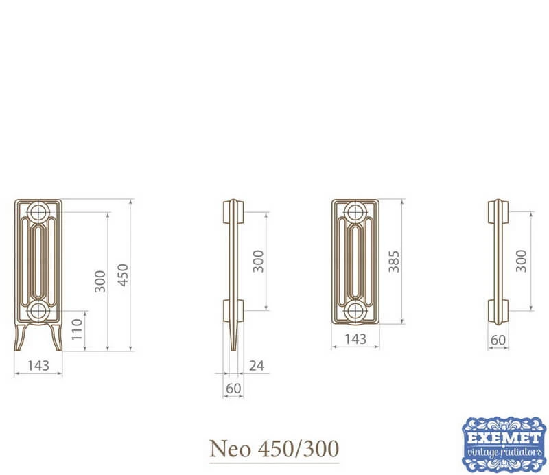 Ретро радиатор Neo 450/300 Exemet имеет стильный и узнаваемый дизайн: строгая форма, трубчатые элементы и заострённые ножки. Дизайнерская модель идеально впишется как в винтажный интерьер, так и в лофт пространство, даже в современной квартире ретро батарея займёт почётное место. Чугунный радиатор Neo 450/300 Exemet рекомендовано использовать только для закрытых систем отопления. Модель изготавливают в напольном исполнении. Ретро батарея Neo 450/300 имеет все необходимые сертификаты качества и гарантию 5 лет (при соблюдении условий эксплуатации). Заказать данный радиатор в любом цвете Вы можете в интернет-магазине Ретроток.