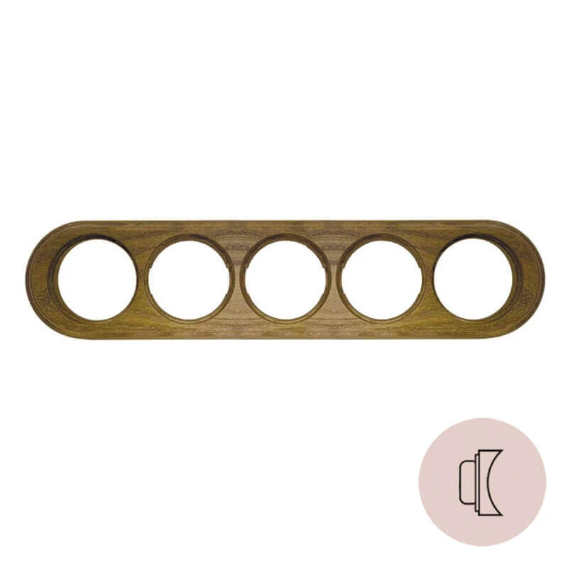 Рамка на бревно 280 мм. 5 местная овал НО15ДЗ280 Salvador из натурального дуба. Данная модель используется для монтажа электротоваров на поверхность бревна или блок-хауса. Больше никаких выпилов! Использование рамки на бревно существенно облегчает процесс установки электротоваров. Рамка на бревно 280 мм. для декоративных розеток и ретро выключателей особенно популярна в интерьерах в стилях лофт, модерн, стимпанк, винтаж и минимализм.