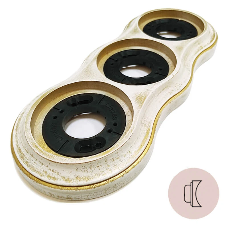 Рамка с пластиковой вставкой 3 местная восьмерка на бревно 240 из натурального бука 25766 Lindas цвет белый с золотой патиной представляет важное дополнение для декоративных розеток и ретро выключателей в современных интерьеров. Данная модель рамки из массива бука часто используется в интерьерах в стилях лофт, винтаж, модерн, стимпанк и минимализм.