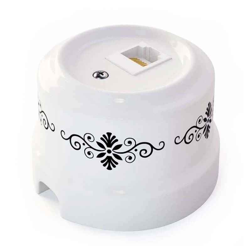 Ретро розетка интернет 32020 Lindas цвет белый с черным узором в купе с ретро проводкой - это отличное решение для современных интерьеров. Данная модель декоративной розетки особенно часто используется в интерьерах в стилях лофт, модерн, стимпанк, винтаж и минимализм.Ретро розетка 32020 Lindas цвет белый с черным узором отвечает всем необходимым стандартам и ГОСТам, имеет сертификат качества. При выборе винтажной розетки Вы не сможете пройти мимо ретро розеток Линдас.Дизайнерская розетка белого цвета сочетается в комплектации с наружной ретро проводкой и винтажными выключателями. Ретро розетки для электропроводки и ее отделки органично соединяют в себе эстетичность и функциональность.
