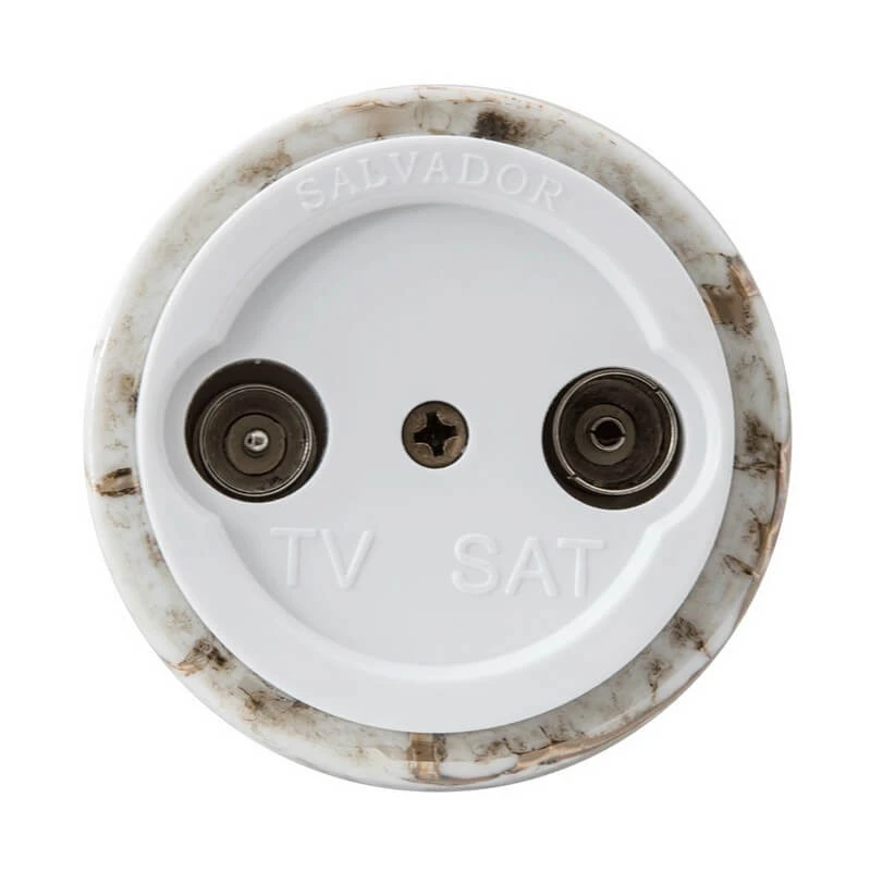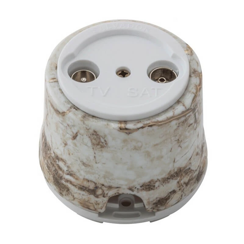 Ретро розетка ТВ OP.TV.MR Salvador цвет мрамор вместе с ретро проводкой - это отличное решение для современных интерьеров. Данная модель декоративной розетки особенно часто используется в интерьерах в стилях лофт, модерн, стимпанк, винтаж и минимализм. Ретро розетка OP.TV.MR Salvador цвет мрамор отвечает всем необходимым стандартам и ГОСТам, имеет сертификат качества. При выборе винтажной розетки Вы не сможете пройти мимо ретро розеток Сальвадор. Дизайнерская розетка сочетается в комплектации с наружной ретро проводкой и винтажными выключателями. Ретро розетки для электропроводки и ее отделки органично соединяют в себе эстетичность и функциональность.