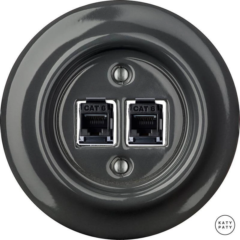 Ретро розетка CRGsCat6 цвет графит глянцевый от чешского бренда Katy Paty изготовлена вручную из фарфора. Данная модель выглядит презентабельно и отлично дополнит интерьер как в современном, так и в ретро стилях. Дизайнерская розетка Katy Paty отличается функциональностью и простотой в использовании. Данная модель разработана с учётом всех современных требований и соответствует европейским стандартам.Винтажная розетка CRGsCat6 цвет графит глянцевый прекрасно сочетается в комплектации с электротоварами для скрытого монтажа. Модель идёт в комплекте с фарфоровой рамкой, шурупы представлены в четырёх цветах на выбор: нержавейка, черный, серебро, латунь.