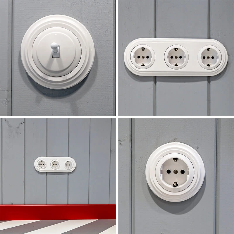 Дизайнерская розетка сочетается в комплектации с ретро проводкой и винтажными выключателями. Ретро розетки для электропроводки и ее отделки органично соединяют в себе эстетичность и функциональность.