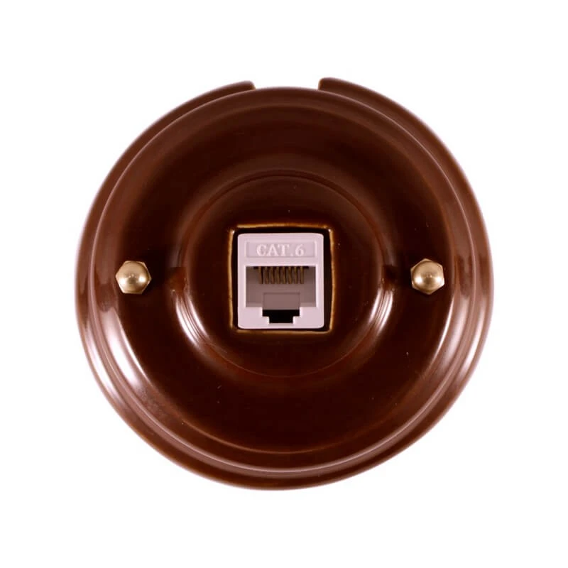 Ретро розетка интернет РК6КЗ ЛЕАНЗА цвет коричневый вместе с ретро проводкой - это отличное решение для современных интерьеров. Данная модель декоративной розетки особенно часто используется в интерьерах в стилях лофт, модерн, стимпанк, винтаж и минимализм. Ретро розетка РК6КЗ ЛЕАНЗА цвет коричневый отвечает всем необходимым стандартам и ГОСТам, имеет сертификат качества. При выборе винтажной розетки Вы не сможете пройти мимо ретро розеток LEANZA. Дизайнерская розетка цвет коричневый сочетается в комплектации с наружной ретро проводкой и винтажными выключателями. Ретро розетки для электропроводки и ее отделки органично соединяют в себе эстетичность и функциональность.