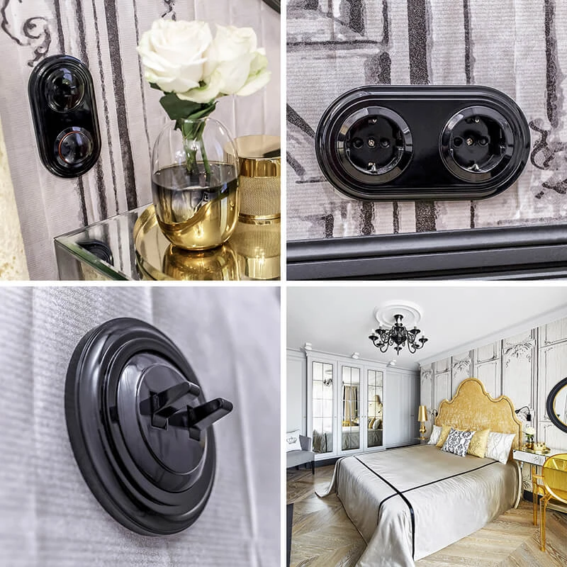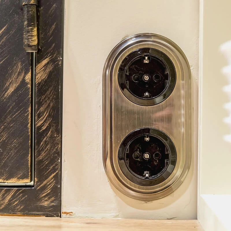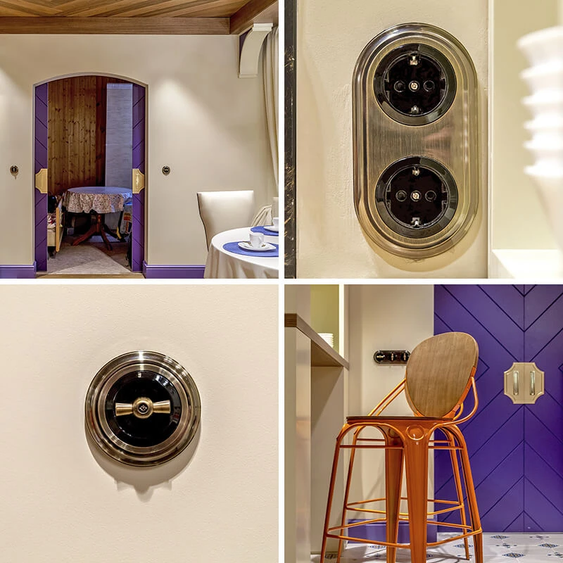 Дизайнерская розетка сочетается в комплектации с ретро проводкой и винтажными выключателями. Ретро розетки для электропроводки и ее отделки органично соединяют в себе эстетичность и функциональность.