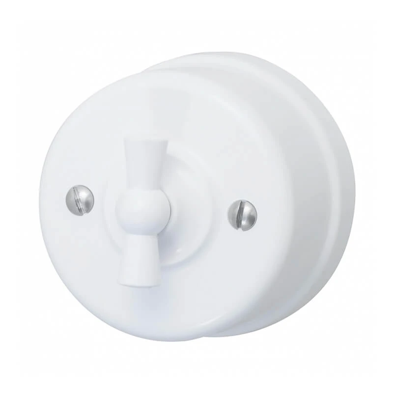 Ретро выключатель прекрасно сочетается в комплектации с интерьерными ретро проводами, наружными латунными трубками или даже с внутренней скрытой проводкой. Выключатель BIRONI цвета белый выполнен из пластика, что придает такому интерьерному аксессуару особую лёгкость и шарм!