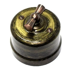 Ретро выключатель пластиковый ФД КерамикЪ цвет бронзовая патина прекрасно подходит для современных интерьерных решений. Винтажный выключатель ФД КерамикЪ VK1RP024m отменного качества. Он разработан с учётом всех современных требований, стандартов и ГОСТов.Так как бронзовая патина - один из самых популярных цветов. Поэтому не удивительно, что такой ретро выключатель наиболее часто используется дизайнерами, как при классических интерьерных решениях, так и в стилях лофт, стимпанк, эко. Данный ретро выключатель прекрасно сочетается в комплектации с интерьерными ретро проводами, наружными латунными трубками или даже с внутренней скрытой проводкой. Выключатель ФД КерамикЪ цвета бронзовая патина выполнен из высокопрочного пластика, что позволяет смело использовать его при открытой проводке.
