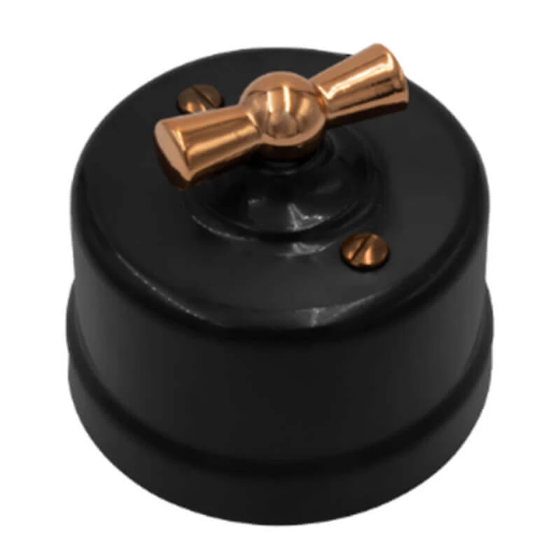 Ретро выключатель пластиковый BIRONI цвет черный прекрасно подходит для современных интерьерных решений. Винтажный выключатель BIRONI B1-201-23-C отменного качества. Он разработан с учётом всех современных требований, стандартов и ГОСТов.Так как черный - один из самых популярных цветов. Поэтому не удивительно, что такой ретро выключатель наиболее часто используется дизайнерами, как при классических интерьерных решениях, так и в стилях лофт, стимпанк, эко. Данный ретро выключатель прекрасно сочетается в комплектации с интерьерными ретро проводами, наружными латунными трубками или даже с внутренней скрытой проводкой. Выключатель BIRONI цвета черный выполнен из высокопрочного пластика, что позволяет смело использовать его при открытой проводке.