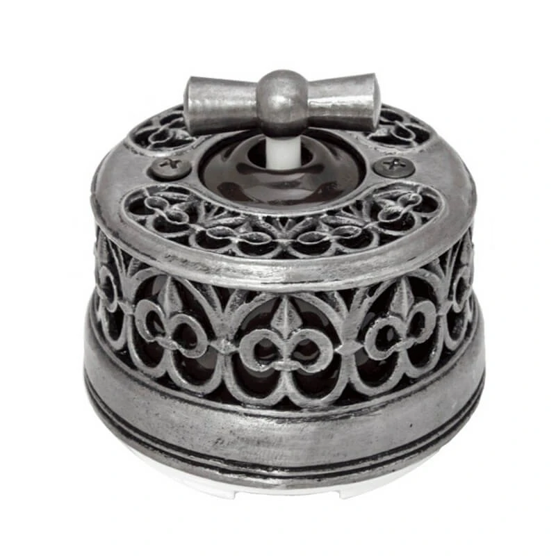 Выключатель Salvador OP21DN.BL четырехпозиционный с декорированный под состаренное серебро представляет отличное решение для современных интерьеров. Данная модель выключателя особенно популярна в интерьерах в стилях лофт, стимпанк и минимализм. Выключатель Сальвадор отвечает всем необходимым стандартам и ГОСТам, имеет сертификат качества.Человек с чувством вкуса при выборе электрики не пройдёт без интереса мимо ретро выключателей Сальвадор. Винтажный выключатель состаренное серебро отлично сочетается в комплектации с наружной ретро проводкой, ретро изоляторами и распаечной коробкой.Таким образом, приобретая комплект ретро электрики Вы получаете не только электрификацию Вашего дома, но и отличное декоративное решение!