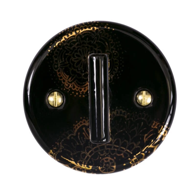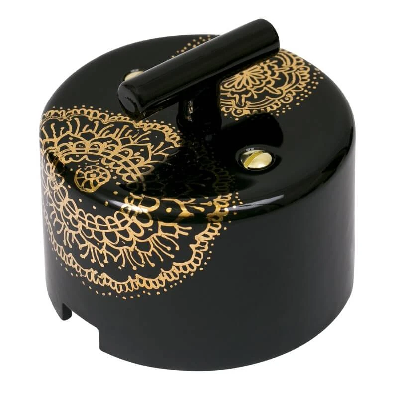 Ретро выключатель двухклавишный GE90401-05E ТМ МезонинЪ цвет черный с золотой росписью имеет цилиндрическую форму. Данная модель представляет отличное решение для современных интерьеров. Выключатель 4-х позиционный прекрасно впишется в интерьеры лофт, стимпанк и минимализм. Модель GE90401-05E отвечает всем необходимым стандартам и ГОСТам, имеет высочайшее качество, подтверждённое сертификатами соответствия.Человек с чувством вкуса при выборе электрики не пройдёт без интереса мимо ретро выключателей ТМ МезонинЪ. Винтажный черный с золотой росписью выключатель отлично сочетается в комплектации с наружной ретро проводкой, ретро изоляторами и распаечной коробкой.Таким образом, приобретая комплект ретро электрики Вы получаете не только электрификацию Вашего дома, но и отличное декоративное решение!