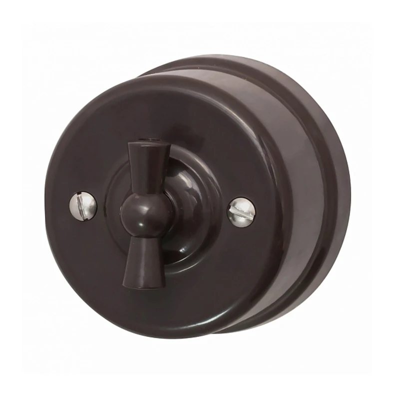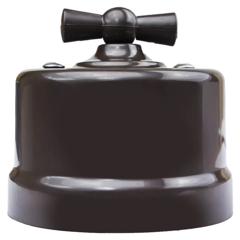 Ретро выключатель BIRONI цвет коричневый прекрасно подходит для современных интерьерных решений. Винтажный выключатель B1-201-22 BIRONI отменного качества. Он разработан с учётом всех современных требований, стандартов и ГОСТов.Так как коричневый - один из самых популярных цветов. Поэтому не удивительно, что такой ретро выключатель наиболее часто используется дизайнерами, как при классических интерьерных решениях, так и в стилях лофт, стимпанк, эко. Данный ретро выключатель прекрасно сочетается в комплектации с интерьерными ретро проводами, наружными латунными трубками или даже с внутренней скрытой проводкой. Выключатель BIRONI цвета коричневый выполнен из пластика, что придает такому интерьерному аксессуару особую лёгкость и шарм!'
