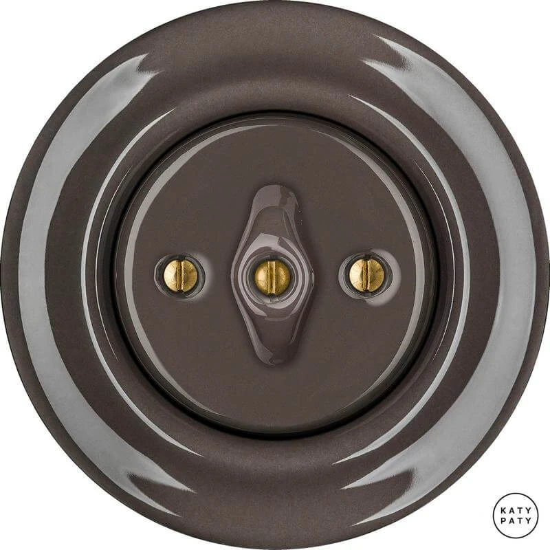 Ретро выключатель BRG6 цвет коричневый глянцевый от чешского бренда Katy Paty изготовлен вручную из фарфора. Данная модель выглядит презентабельно и отлично дополнит интерьер как в современном, так и в ретро стиле. Дизайнерский выключатель Katy Paty отличается функциональностью и простотой в использовании. Данная модель разработана с учётом всех современных требований и соответствует европейским стандартам.Винтажный выключатель BRG6 цвет коричневый глянцевый прекрасно сочетается в комплектации с электротоварами для скрытого монтажа. Модель идёт в комплекте с фарфоровой рамкой, шурупы представлены в четырёх цветах на выбор: нержавейка, черный, серебро, латунь.