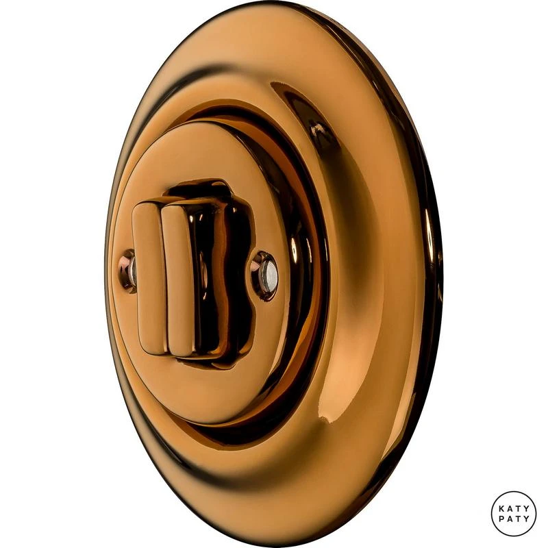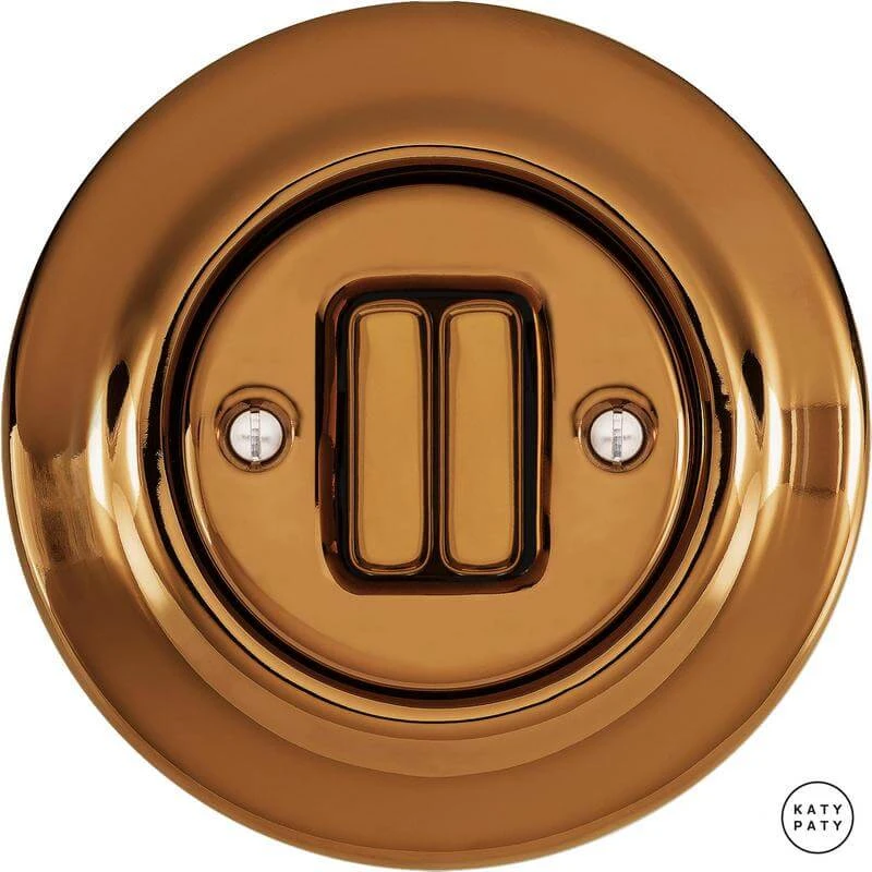 Ретро выключатель OPCUNG2Sl6/6 цвет медный глянцевый от чешского бренда Katy Paty изготовлен вручную из фарфора. Данная модель выглядит презентабельно и отлично дополнит интерьер как в современном, так и в ретро стиле. Дизайнерский выключатель Katy Paty отличается функциональностью и простотой в использовании. Данная модель разработана с учётом всех современных требований и соответствует европейским стандартам.Винтажный выключатель OPCUNG2Sl6/6 цвет медный глянцевый прекрасно сочетается в комплектации с электротоварами для скрытого монтажа. Модель идёт в комплекте с фарфоровой рамкой, шурупы представлены в четырёх цветах на выбор: нержавейка, черный, серебро, латунь.