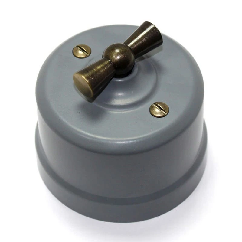 Ретро выключатель пластиковый ФД КерамикЪ цвет серый прекрасно подходит для современных интерьерных решений. Винтажный выключатель ФД КерамикЪ VK1RP007b отменного качества. Он разработан с учётом всех современных требований, стандартов и ГОСТов.Так как серый - один из самых популярных цветов. Поэтому не удивительно, что такой ретро выключатель наиболее часто используется дизайнерами, как при классических интерьерных решениях, так и в стилях лофт, стимпанк, эко. Данный ретро выключатель прекрасно сочетается в комплектации с интерьерными ретро проводами, наружными латунными трубками или даже с внутренней скрытой проводкой. Выключатель ФД КерамикЪ цвета серый выполнен из высокопрочного пластика, что позволяет смело использовать его при открытой проводке.