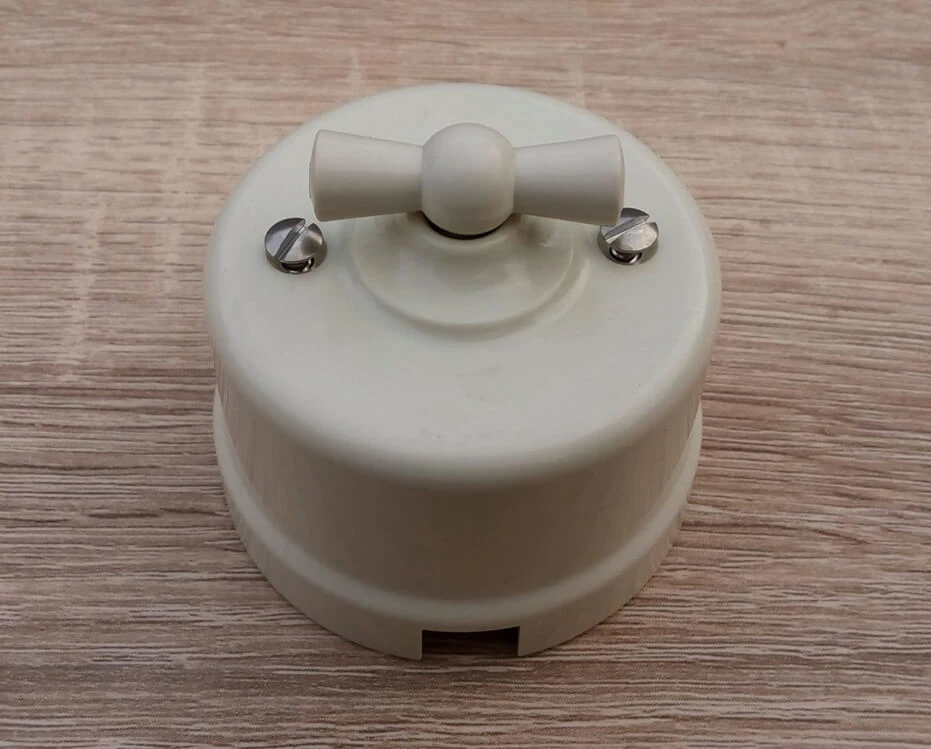 Ретро выключатель пластиковый BIRONI цвет слоновая кость прекрасно подходит для современных интерьерных решений. Винтажный выключатель BIRONI B1-203-211 отменного качества. Он разработан с учётом всех современных требований, стандартов и ГОСТов.Так как слоновая кость - один из самых популярных цветов. Поэтому не удивительно, что такой ретро выключатель наиболее часто используется дизайнерами, как при классических интерьерных решениях, так и в стилях лофт, стимпанк, эко. Данный ретро выключатель прекрасно сочетается в комплектации с интерьерными ретро проводами, наружными латунными трубками или даже с внутренней скрытой проводкой. Выключатель BIRONI цвета слоновая кость выполнен из высокопрочного пластика, что позволяет смело использовать его при открытой проводке.