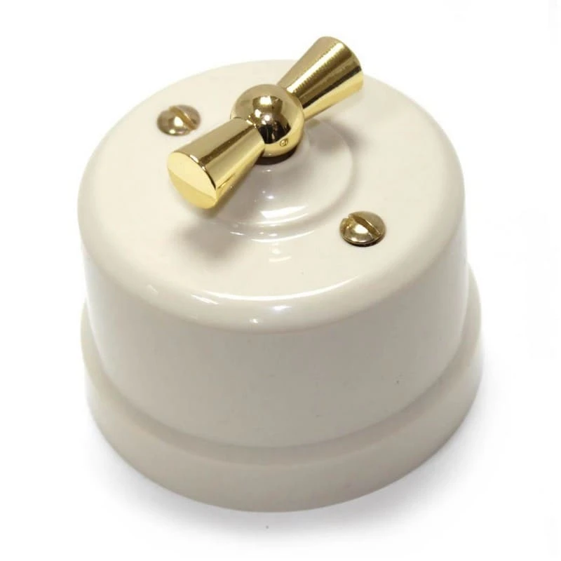 Ретро выключатель пластиковый ФД КерамикЪ цвет слоновая кость прекрасно подходит для современных интерьерных решений. Винтажный выключатель ФД КерамикЪ VK2RO005z отменного качества. Он разработан с учётом всех современных требований, стандартов и ГОСТов.Так как слоновая кость - один из самых популярных цветов. Поэтому не удивительно, что такой ретро выключатель наиболее часто используется дизайнерами, как при классических интерьерных решениях, так и в стилях лофт, стимпанк, эко. Данный ретро выключатель прекрасно сочетается в комплектации с интерьерными ретро проводами, наружными латунными трубками или даже с внутренней скрытой проводкой. Выключатель ФД КерамикЪ цвета слоновая кость выполнен из высокопрочного пластика, что позволяет смело использовать его при открытой проводке.